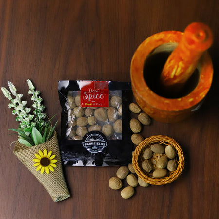 A 50-gram pack of FF Desi Jaifal (nutmeg), known for its warm, aromatic flavor. Ideal for adding depth to sweet and savory dishes, including desserts, curries, and beverages.