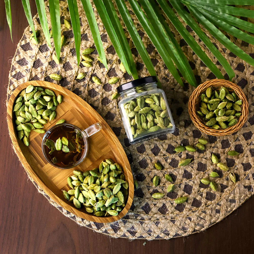 Aromatic green cardamom pods with a sweet, floral flavor, perfect for enhancing teas, desserts, and savory dishes.