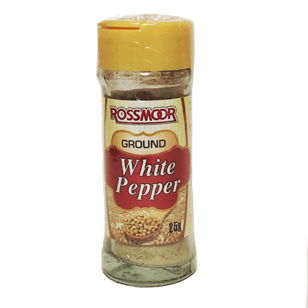 A 25-gram pack of Rossmoor ground white pepper, offering a mild, earthy heat. Ideal for light-colored dishes like white sauces, soups, and mashed potatoes where black specks are not desired.